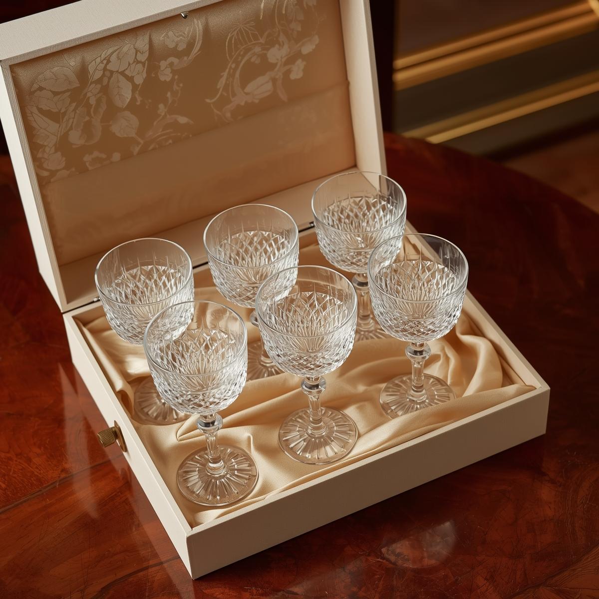 Elegant hand-cut crystal wine glasses, designed to elevate fine dining experiences. Perfect for hosts & hostesses.