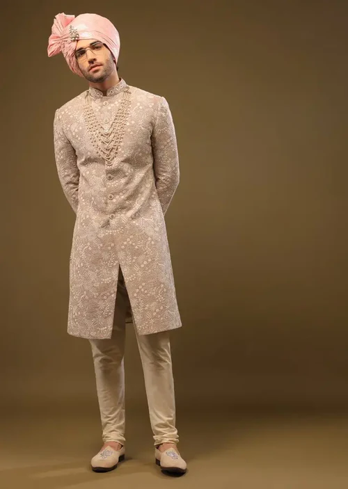 Intricately detailed embroidery in resplendent gold and silver threads enhances its majestic appeal, while the rich velvet fabric ensures comfort and durability. Perfect for weddings, receptions, and festive occasions, this sherwani is the epitome of timeless luxury.